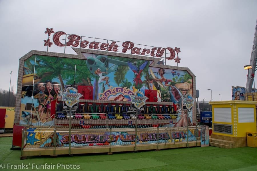 Many Miami funfair rides have bespoke painted backdrops. Our backdrop is a 'Beach Party' scene.